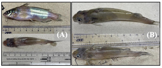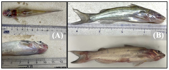 Images depicting catfish with clinical signs due to (A) co-infection with F. covae first, then E. ictaluri 48 h post-initial inoculation, or (B) infection only with F. covae.