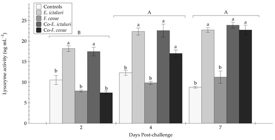 The lysozyme activity (µg mL–1) in sera from sampled fish at two, four, and seven days post-challenge. Each treatment group was conducted in triplicate (n = 3). Capital letters indicate significant differences in activity between treatment periods, and lowercase letters represent significance within treatment groups. Error bars represent the standard error of the mean for each treatment group.