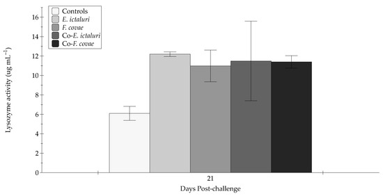 The lysozyme activity (µg mL–1) in sera from sampled fish at 21 days post-challenge. Each treatment group was conducted in triplicate (n = 3). Error bars represent the standard error of the mean for each treatment group.