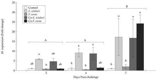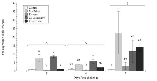 The il1β expression (fold-change) was evaluated from extracted anterior kidneys during two, four, and seven days post-challenge. Each treatment group was conducted in triplicate (n = 3). Capital letters indicate significant differences in quantity between treatment periods, and lowercase letters represent significance within treatment groups. Bars represent the standard error of the mean for each treatment.