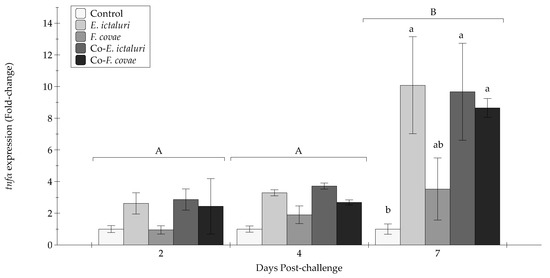 The tnfα expression (fold-change) was evaluated at two, four, and seven days post-challenge. Each treatment group was conducted in triplicate (n = 3). Capital letters indicate significant differences in quantity between treatment periods, and lowercase letters represent significance within treatment groups. Bars represent the standard error of the mean for each treatment.
