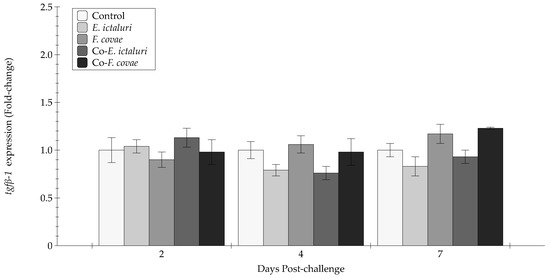 The tgfβ-1 expression (fold-change) was evaluated from extracted anterior kidneys during two, four, and seven days post-challenge. Each treatment group was assessed in triplicate (n = 3). Bars represent the standard error of the mean for each treatment.