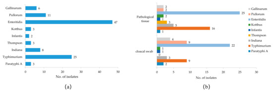 - Wang, J.; Li, J.; Liu, F.; Cheng, Y.; Su, J. Characterization of Salmonella enterica isolates from diseased poultry in northern China between 2014 and 2018. Pathogens 2020, 9, 95. [Google Scholar] [CrossRef]