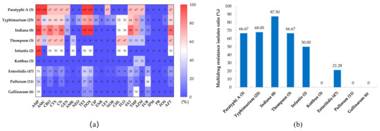 - Cui, M.; Xie, M.; Qu, Z.; Zhao, S.; Wang, J.; Wang, Y.; He, T.; Wang, H.; Zuo, Z.; Wu, C. Prevalence and antimicrobial resistance of Salmonella isolated from an integrated broiler chicken supply chain in Qingdao, China. Food Control 2016, 62, 270–276. [Google Scholar] [CrossRef]