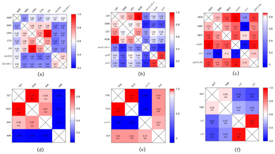 - Bourély, C.; Cazeau, G.; Jarrige, N.; Jouy, E.; Haenni, M.; Lupo, A.; Madec, J.Y.; Leblond, A.; Gay, E. Co-resistance to amoxicillin and tetracycline as an indicator of multidrug resistance in Escherichia coli isolates from animals. Front. Microbiol. 2019, 10, 2288. [Google Scholar] [CrossRef]