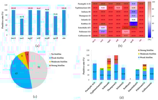 3.4. The Prevalence of Virulence Genes and the Biofilm-Producing Ability of Salmonella Isolates