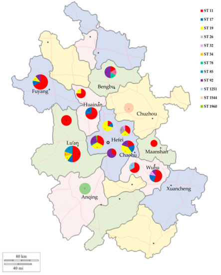 - Zhang, K.; Ge, H.; He, J.; Hu, M.; Xu, Z.; Jiao, X.; Chen, X. Salmonella Typhimurium ST34 isolate was more resistant than the ST19 isolate in China, 2007– 2019. Foodborne Pathog. Dis. 2022, 19, 62–69. [Google Scholar] [CrossRef]