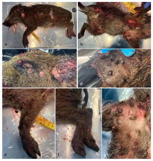 Gross aspect of the affected wild boar: (a) left flak; (b) ventral view; (c) detail of the head and periocular region; (d) detail of the pinna; (e,f) front and back legs; (g) axillary region.