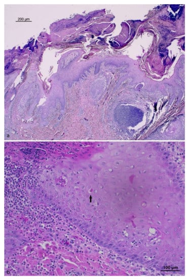 Skin, wild boar pinna: (a) severe pustular epidermitis with crusted areas (HE), Bar = 200 μm; (b) hyperplastic epidermis with eosinophilic inclusion body (black arrow) in the cytoplasm of keratinocytes (HE), Bar = 100 μm.