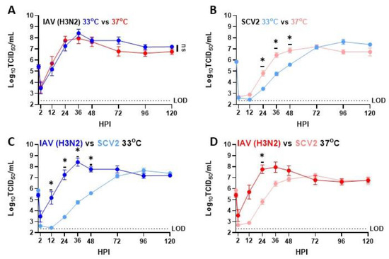 Replication of SARS-CoV-2 and IAV viruses in hNECs at 33 °C or 37 °C. Multistep growth curves at an MOI of 0.5 infectious units/cell were performed on hNECs at 33 °C and 37 °C with the indicated viruses. Data are pooled from two independent experiments with different donors, each with n = 3 wells per virus (total n = 6 wells per virus). * p < 0.05 (two-way repeated measures ANOVA with Tukey’s post-test, analyzed by timepoint). 0–2 h excluded from statistical analysis. Dotted line indicates limit of detection. Data are graphed to show both replication of the viruses at the two different temperatures (A,B) as well as between the two viruses at the same temperature (C,D).