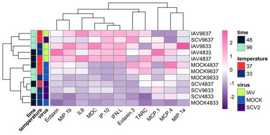To determine if recent clinical isolates of IAV and early isolates of SCV2 showed temperature-dependent replication, low MOI multistep growth curves were performed on human nasal epithelial cell (hNEC) cultures at either 33 °C, a temperature consistent with the upper respiratory tract, or 37 °C, a temperature consistent with the lower respiratory tract (Figure 1). While IAV showed no significant differences in replication kinetics due to temperature, SCV2 showed faster initial replication at 37 °C compared to 33 °C (Figure 1A,B). Additionally, SCV2 showed significantly slower replication kinetics compared to IAV at 33 °C (Figure 1C) and 37 °C (Figure 1D). Basolateral supernatant from mock-, IAV-, or SCV2-infected hNEC cultures was collected 48 and 96 HPI, and secreted interferon, cytokines, and chemokines related to the proinflammatory response were measured by ELISA and MSD assay, as has been previously described to evaluate epithelial responses to infection [39,44,45] (Figure 2). While cytokine production and release is directional in polarized epithelial cells, previous research has shown that apical versus basolateral release differs mainly in quantity, rather than type, of cytokine released [39,44]. Values for each condition were averaged and scaled to calculate the Z-score, and then hierarchical clustering was performed to identify patterns in the data. Overall, IAV-infected hNECs secreted higher amounts of chemokines, cytokines, and interferon than SCV2-infected hNECs. Additionally, higher temperatures during infection and later timepoints correlated with higher production. Finally, only late, high-temperature SCV2-infected hNECs clustered with any IAV-infected samples. All other SCV2-infected samples, even with high infectious virus loads, clustered with mock-infected samples, suggesting a dampened or delayed innate immune response to SCV2 infection in epithelial cells.