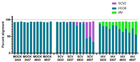 In order to identify host factors that may drive both temperature-dependent replicative fitness as well as differences in epithelial cell transcriptional responses, RNA-sequencing was performed on mock-, IAV-, or SCV2-infected hNECs at either 33 °C or 37 °C. Samples were collected either 24 or 48 HPI to focus on early infection responses. The 24 HPI samples will be hereafter referred to as “early” infection, while the 48 HPI will be referred to as “late” infection. Additionally, 33 °C will be referred to as “low” temperature, while 37 °C will be referred to as “high” temperature. Reads were first aligned to the human grch38 genome for annotation, but most late infection samples showed poor (<50%) alignment. Unaligned reads were then aligned to both reference IAV and SCV2 genomes, leading to overall alignment scores of >90% for all samples (Figure 3). Despite low human alignment scores for highly SCV2- and all IAV-infected samples, the depth of sequencing allowed us to still be able to successfully capture responses due to temperature and infection (Supplementary Figure S1).