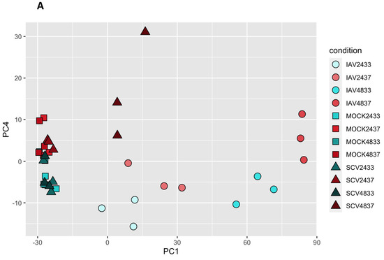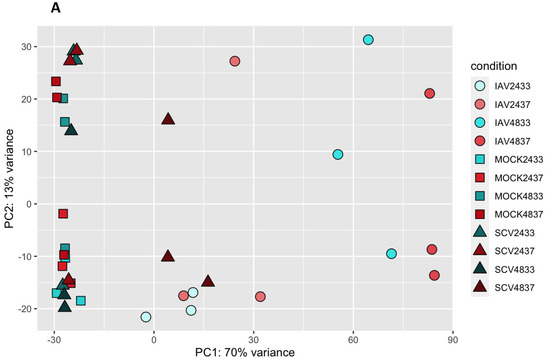 The iSeq and NovaSeq data files were uploaded to the Partek Server and analysis was performed using Partek Flow NGS software with the RNA Toolkit, as follows: first, pre-alignment QA/QC and trimming of reads were performed. Following this, sequences were uploaded to the beer lab cluster for further analysis. Sequences were first checked for quality using FastQC [47]. All sequences were determined to be of good quality and were then aligned using HISAT2 to the GRCH38 genome [48,49]. Sequences were also aligned to the whole genome sequence of stock viruses obtained from the Influenza Research Database and NCBI [50,51]. SAM files were then converted to BAM using samtools [52]. A gene- count matrix was then generated from BAM files using the “featureCounts” R package, and differential expression analysis was performed using “DESeq2” in R [53,54]. Pathway analysis of differentially expressed genes was also performed using the R packages “clusterProfiler” and “gProfiler” and MSigDB [55,56,57]. Heatmaps were generated and hierarchical clustering was performed using the R package “pheatmap” [46]. Upset plot was generated using the R package “UpSetR” [58]. Other plots were made in base R or using the R package “ggplot” [59]. For detailed methods and a full list of packages used, please see https://github.com/JRes9/Resnicketal_IAVvSCV2temperature_2023 (Accessed on 16 March 2023).