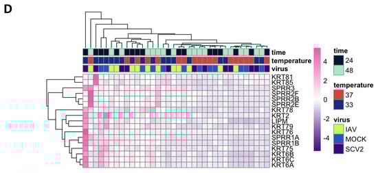 In order to identify variance due to temperature, further principal components (PCs) were investigated. Samples were observed to cluster by temperature along PC4 (Figure 6A). The top 250 genes defining each cluster of PC4 were identified and pathway enrichment revealed that high-temperature samples were defined by high infection responses, likely due to the fact that we observed higher levels of infection in these samples (Figure 1, Figure 3, Figure S2, and Figure 6B). In contrast, low-temperature samples showed a strong signature for keratinization (Figure 6C and Figure S5A). The relative expression of the top 17 genes defining the keratinization phenotype was determined and hierarchical clustering confirmed that this was an early marker of low-temperature samples regardless of treatment (Figure 6D). Additionally, the combined expression of the top 10 differentially expressed keratin-related genes showed clear separation between 33 °C and 37 °C samples (Supplementary Figure S4). Finally, genes that were more highly expressed in high-temperature mock-infected samples were related to pathways involved in ion transport and tissue development, which may point to metabolic differences between cells at different temperatures (Supplementary Figure S5B).