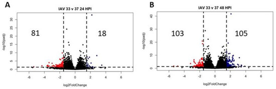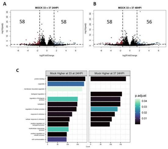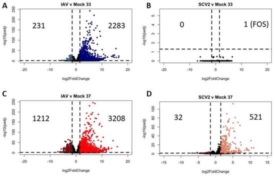Differential gene expression due to infection. Differential expression analysis was performed between infected samples at 33 °C or 37 °C at 48 HPI and their matched mock-infected samples as indicated (A–D). Data were pooled from three replicate wells. Log2 fold change indicates the mean expression for each gene. Each dot represents one gene. Black dots indicate no significantly differential expression between the two indicated groups. Colored dots indicate both a significant p value (padj < 0.05) and log 2 fold change (1.5).