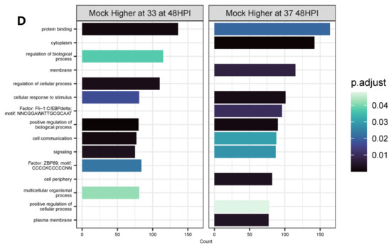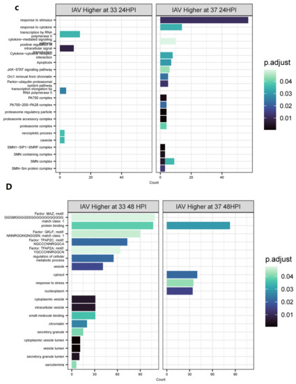 Transcriptomic changes due to temperature over time. Differential expression analysis was performed between mock-infected samples at 33°C or 37 °C at 24 (A) or 48 (B) HPI. Significantly differentially expressed genes (p < 0.05, log2FC > 0) were then used in pathway enrichment analysis for each timepoint (C,D). The size of the bars indicates the number of genes identified in that pathway and the bars are colored based on p value.