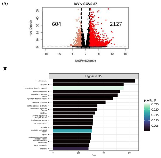 Transcriptomic changes due to virus used for infection. Differential expression analysis was performed between IAV- and SCV2-infected samples at 37 °C at 48 HPI (A). Significantly differentially expressed genes (p < 0.05, log2FC > 1.5) were then used in pathway enrichment analysis for each timepoint (B,C). The size of the bars indicates the number of genes identified in that pathway and the bars are colored based on p value.