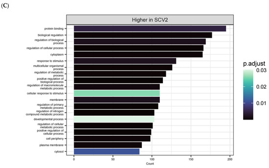 To identify whether there were differences in the epithelial cell response due to the virus used, high temperature, late timepoint SCV2- and IAV-infected samples were compared (Figure 10). Overall, there were almost 3000 differentially expressed genes due to virus infection (Figure 10A). IAV-infected samples showed increased expression of genes in pathways related to the membrane and membrane-associated factors, while SCV2-infected samples showed increased expression of genes related to cell periphery and metabolism (Figure 10B,C). This difference could be due to slightly different replication cycles used by IAV and SCV2 viruses, or it could reflect how the cultures attempted to heal from infection, as the 48 HPI timepoint was peak production of IAV infectious virus.