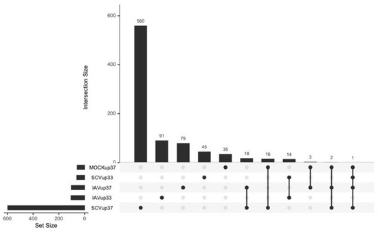 Finally, to identify genes that drive temperature-specific infection responses, differentially expressed genes due to temperature within each condition (IAV-, SCV2-, mock-infected) were compared (Figure 11). The gene lists were generated from the pairwise comparisons (Figure 7B and Figure 9B, SCV2 not shown). Overall, SCV2 infection at 37 °C was the most unique with 611 DEGs, likely due to the fact that SCV2-infected samples at 33 °C were highly similar to mock-infected samples. Both SCV2- and IAV-infected samples at 37 °C had uniquely higher expression of 18 genes in common, including APOBEC3 genes (APOBEC3A, APOBEC3B, and APOBEC3B-AS1), ssDNA binding protein SHOC1, and pseudogenes CLCA3P and NCF1B, suggesting higher chromatin instability during infection at higher temperatures (Supplementary Table S1). High-temperature infections also uniquely upregulated immune genes such as CCL20 and AIM2. Additionally, high-temperature infections uniquely upregulated STX19, which is involved in SNARE binding and could impact the efficiency of viral fusion [29,60]. In contrast, immune-related genes such as IFITIM10 and MPV17L were some of the 14 genes uniquely upregulated due to IAV or SCV2 infection at lower temperatures (Supplementary Table S2). All high-temperature samples (IAV-, SCV2-, and mock-infected) had uniquely higher expression of three genes–CLCA3P, RNAS1, and SLC51B—two of which are involved in transport (Supplementary Table S3). In contrast, low-temperature samples all had uniquely higher expression of four genes—CYP4A11, TGFBR3L, RNF32-DT, and RBM3—three of which are involved in metabolism and proliferation (Supplementary Table S4).