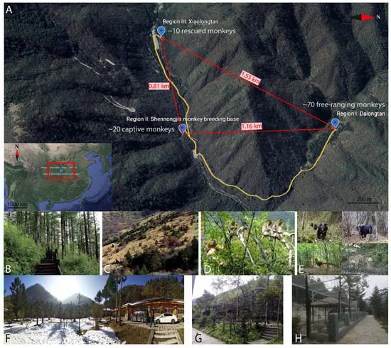 About 100 golden snub-nosed monkeys were artificially (captive monkey) or semi-artificially (free-ranging monkey) kept in Shennongjia Nature Reserve in three regions, as follows. Region I: the Dalongtan area (110°31′93″ N, 31°49′25″ E), in which about 70 free-ranging monkeys lived, consisting of 4 one-male units (OMU) and 1 all-male unit (AMU) (Figure 1E); Region II: the Shennongjia breeding base for golden snub-nosed monkeys (110.31′74″ N 34, 31.48′59″ E), in which about 20 monkeys were kept, and where the monkeys were randomly divided into 3 OMUs by animal caretakers, with each unit caged in a large steel house (Figure 1F); Region III: the Xiaolongtan area (110°31′44″ N, 31°48′38″ E), which is used to hold rescued monkeys collected from different areas of Shennongjia Reserve with physical injuries (Figure 1G). There were about 10 monkeys in the cage, which were thus considered as one unit. The straight-line distance between each region was from 0.81 km to 1.55 km, but Region I is separated from region II and III by the mountain barrier. These three regions are connected by asphalt roads, which are easily accessible for researchers and tourists (Figure 1A).