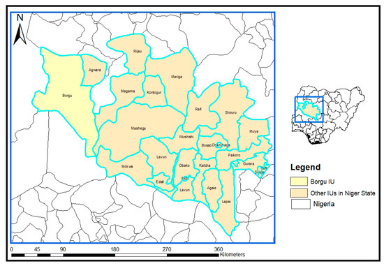 Map of Niger state showing the 25 implementation units, with Borgu and Nigeria as a highlight and inset, respectively.