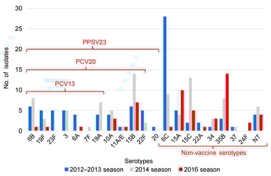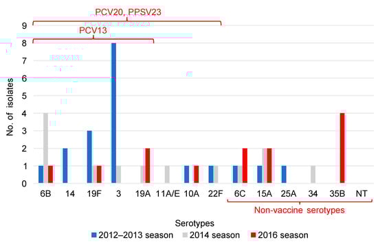 In adults, a significant increase in isolates with serotypes not included in any vaccine was observed (p ≤ 0.026) (Table 3); serotype 3 was the most common serotype detected in the 2012–2013 season, while 35B was the most detected in the 2016 season (Figure 2).