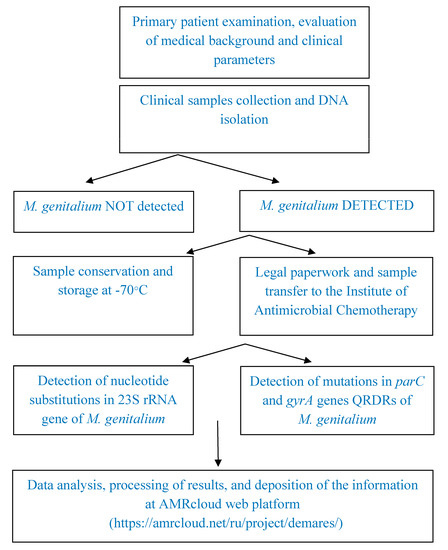 The experimental collection included 213 DNA samples isolated from M. genitalium-positive cervical and urethral swab specimens obtained from patients examined at the Moscow Scientific and Practical Center of Dermatovenerology and Cosmetology (MSPCDC) and screened for sexually transmitted diseases (STD). DNA was isolated at a local lab using a “MagnoPrime-FAST” kit (NextBio LTD, Moscow, Russia); M. genitalium DNA presence was detected using a “AmpliPrime® NCMT” PCR reagent multiplex kit according to the manufacturer’s instructions (NextBio LTD, Moscow, Russia). The commercial PCR assay kit allows for the simultaneous detection of N. gonorrhoeae DNA, C. trachomatis DNA, M. genitalium DNA, and T. vaginalis DNA. DNA samples were frozen and stored at −70 °C until they were sent to the Laboratory of Molecular Diagnostics at the Institute of Antimicrobial Chemotherapy, Smolensk State Medical University, Russia. The mutations associated with macrolide and fluoroquinolone resistance were identified using Sanger sequencing under the scope of the “DeMaRes” (Detection of Macrolide Resistance in Mycoplasma genitalium) investigation project (https://amrcloud.net/en/project/demares/, accessed on 3 February 2023). The whole sample set and the associated information were processed according to established protocols, and the experimental steps are depicted in Figure 1.