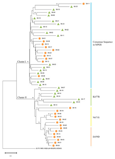 Together with the mutations in the MPER, we found that sequences consistent with the consensus sequence in the MPER were in Cluster I, and sequences containing mutations were in Cluster II (Figure 1 and Figure 2A). Furthermore, sequences containing the same MPER mutation subclustered together in secondary evolutionary clusters. For example, in Cluster II, the env sequences from 2006 containing the K677R mutation clustered in the same subcluster, and the sequences from 2009 containing the E659D mutations clustered in the same subcluster (Figure 1). It should be noted that 06–07 was the only env sequence in Cluster II with the MPER consensus sequence.