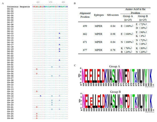 We then grouped env sequences obtained in 2006 and 2009, named group A (n = 25) and group B (n = 25), respectively, and compared the inconsistent positions in the MPER between these two groups of the sequences using the SH method. An examination of all the positions in the MPER revealed four mutated positions: 659D, 662K, 671S, and 677N/R. The mutation 677R in group A disappeared and was replaced by mutation 677N in group B, and, hence, position 677 had the lowest SH value, implying that it had the greatest variation from 2006 to 2009 (Figure 2B). In group B, mutations 659D and 671S were in the same proportion, but they did not coexist in a single sequence (Figure 2A,B). The highest SH value was at position 662, corresponding to only 1 of the 25 sequences with the 662K mutation. More data are needed to supplement the trend regarding position 662.