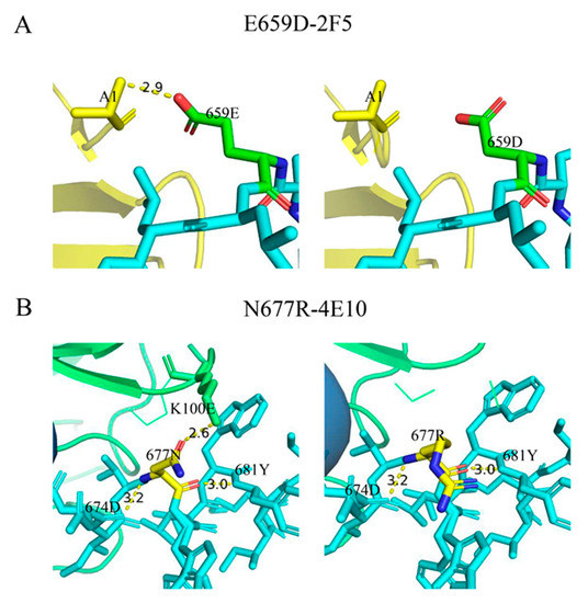 To investigate the effect of mutations 659D and 677R on the neutralization sensitivity, we simulated the interaction of these two mutated epitopes with the mAbs 2F5 and 4E10. The Fab-gp41 peptide complexes carried either gp41 peptides 656–674 or 671–685, and the interactions of gp41 659D with 2F5, and 677R with 4E10, were simulated [26,32]. We found that 659E contacted A1 on 2F5 with a hydrogen bond length of 2.9 Å; however, once 659E mutated to 659D, there was no contact between these two amino acids (Figure 3A). Compared to glutamic acid (E), aspartic acid (D) is a negatively charged amino acid, which may contribute to a decrease in the contact between residues 659 of gp41 and 2F5. In addition, 677N was in contact with Lys100E(H) (K100E) on 4E10 with a hydrogen bond length of 2.6 Å; however, residue 677R no longer had contact with 4E10 (Figure 3B). Although asparagine (N) and arginine (R) are both polar amino acids, N is uncharged and R is positively charged. As residue 100 on 4E10 is lysine (K), a positively charged amino acid, 677R may interact with Lys100E(H) in a mutually exclusive manner, affecting the binding of residue 677 to 4E10.