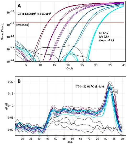 qPCR SYBR Green. (A) CT: Cycle threshold in the L. infantum standard curve shows serial dilutions of 7.8 × 105 to 7.8 × 100; Efficiency (E) = 0.83, R2 = 0.98, and Slope = −3.80. (B) L. infantum melting curve analysis with MT = 81.9 °C ± 0.24.