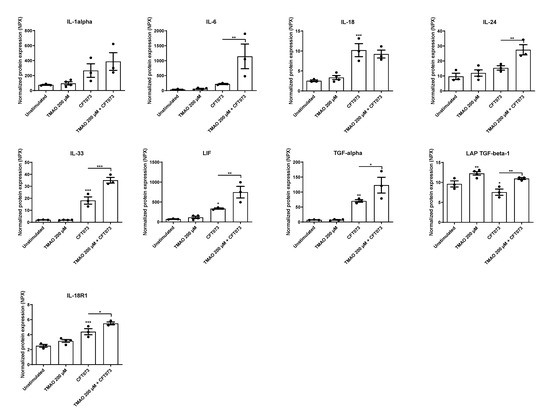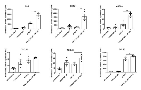 TMAO promotes increased chemokine release. Bladder epithelial cells were pre-stimulated with 200 µM TMAO for 2 h prior to CFT073 (MOI 10) infection for 24 h followed by analysis of protein expression using a panel of inflammation-related proteins. Data are presented as mean ± SEM (n = 3–4 independent experiments). Asterisks denote statistical significance compared to unstimulated cells (* p < 0.05, ** p < 0.01, *** p < 0.001).
