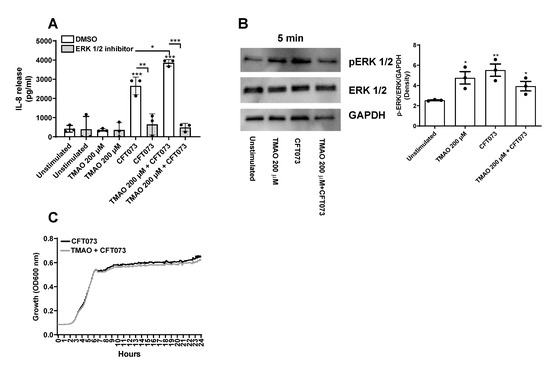 The next step was to identify the signaling pathway through which TMAO enhances UPEC-mediated inflammation. We chose to use IL-8 as our inflammatory marker, as it is one of the most important chemokines during a UTI [19,20]. We investigated the involvement of ERK1/2, as it has been shown to be important for UPEC-mediated cytokine/chemokine release [15,21,22] and TMAO-mediated inflammation [23,24]. We found, by using a ERK 1/2 inhibitor, that the IL-8 release induced by CFT073 alone or in combination with TMAO was dependent on ERK 1/2 signaling (Figure 5A). In addition, western blot results showed that bladder epithelial cells expressed higher levels of p-ERK1/2 after 5 min of stimulation with CFT073, TMAO, or the combination of TMAO and CFT073 compared to unstimulated cells (Figure 5B). Furthermore, we also investigated if TMAO could enhance bacterial growth. We found that TMAO did not enhance CFT073 growth compared to CFT073 alone (Figure 5C) during 24 h.