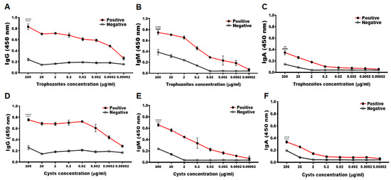 Confirmation of specific antibody responses against Acanthamoeba trophozoites and cysts. The CM-specific IgG, IgM, and IgA antibody titers were determined using serially diluted A. castellanii trophozoites (A–C) and cysts (D–F) lysates. Asterisks denote statistically significant differences between positive (red lined ●) and negative (black lined ○) serum (** p < 0.01, *** p < 0.001, and **** p < 0.0001).