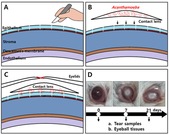 Experimental design for AK animal models. After scratching the corneas of BALB/c mice (A), contact lenses incubated with A. castellanii trophozoite (1 × 105 cells) inoculum were allowed to adhere to the corneal surface (B). Suturing of eyelids to ensure prolonged physical contact and prevent contact lenses from falling off (C). Experimental scheduling for tear samples and eyeball tissue acquisition from AK-induced mice on day 7 (n = 7) and day 21 (n = 7) (D). Naïve mice were also run in parallel (n = 5).