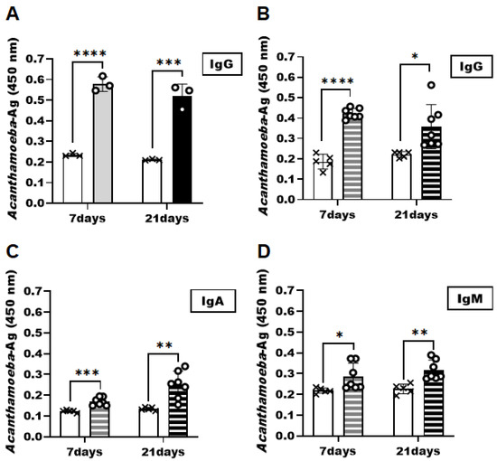 To demonstrate that the Acanthamoeba specificity of the CM antibody observed in vitro is also applicable in vivo, ELISA was performed using the samples acquired from the AK mice model at 7 and 21 dpi (Figure 4). CM antibody successfully interacted with the Acanthamoeba antigens in tear samples acquired at both infection time points (Figure 4A). Compared to the control group, significantly greater Acanthamoeba-specific antibody responses were elicited in the AK mice model. However, significant differences in antigen-specific antibody responses were not observed in the AK mice samples between the two sampling time points. Consistent with the results of the tear samples, Acanthamoeba-specific antibody responses were also detected in the eyeball tissues of the AK animal model (Figure 4B–D). The eyeball tissue lysates of the AK model collected on 7 and 21 dpi were substantially higher than those of their naïve counterparts. Acanthamoeba-specific IgG levels detected using the CM antibody in eyeball lysates were comparable to those observed in tear samples (Figure 4B). However, though significantly greater than the controls, IgA (Figure 4C) and IgM (Figure 4D) responses were elicited to a weaker extent than the IgG in the murine AK samples.