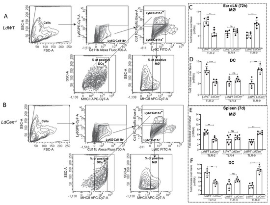 LdCen−/− infection induces TLR-9 expression in ear dLN and spleen-derived macrophages and dendritic cells. Macrophages (MØ) (Cd11b+Ly6C−Ly6G−CD11c−MHCII+) and DCs (Cd11b+Ly6C−Ly6G−CD11c+MHCIIhi) were flow sorted from the ear dLN or spleen 72 h and 7 d post infection, respectively. (A,B) Sorting strategy showing the percentage of the positive population of macrophages and DCs from ear dLN of LdWT and LdCen−/− infected mice. (C–F) mRNA expression levels of TLR-2, 4, and 9 from sorted macrophages and DCs in (C,D) ear dLN and (E,F) spleen were estimated by qPCR as described in Materials and Methods and expressed as fold change from uninfected naive mice. The experiment was repeated three times with pooled digests from five to six ear dLNs per experiment. The data represent the mean values ± SD of results from three independent experiments that all yielded similar results (n = 6). ** p < 0.005; *** p < 0.0005 between the groups.