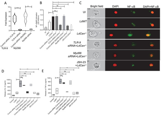 3.2. LdCen−/− Infected DCs Showed Heighted NF-κB Activation and Proinflammatory Cytokine Response via TLR-9- Myd88 Pathway