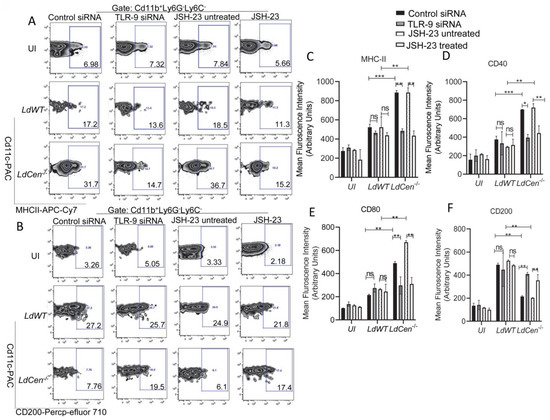 3.3. TLR-9 Silencing or Inhibition of NF-κB Transcriptional Activity Significantly Reduced the Expression of Costimulatory Molecules While Augmenting Expression of Coinhibitory Molecule in LdCen−/− Infected DCs