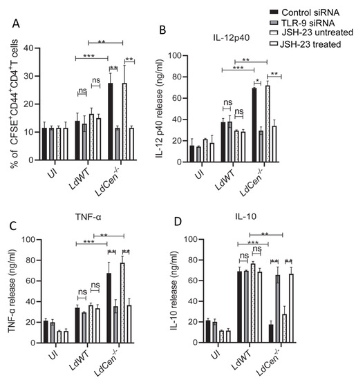 We analyzed the effect of TLR-9 silencing or inhibition of NF-κB transcriptional activity on the functional activity of DCs. We specifically examined the capacity of parasite antigens to be presented by infected DCs to CFSE-labeled naïve CD4+T cells to determine their antigen presentation capabilities under TLR-9 siRNA or JSH-23 treated/untreated conditions (Figure 4A). LdCen−/− infected DCs significantly increased antigen-specific CD4+T cell proliferation after 5 days of co-culture compared to those co-cultured with DCs from uninfected or LdWT infected under control siRNA or JSH-23 untreated conditions (Figure 4A). Following TLR-9 silencing/NF-κB inhibition, antigen-specific CD4+ T cell proliferation co-cultured with DCs from uninfected and LdWT-infected cultures did not vary (Figure 4A). However, the proliferation of Ag-specific CD4+T cells was significantly reduced in LdCen−/− infected DCs compared to the same population from control siRNA or JSH-23 untreated LdCen−/− infected DCs (Figure 4A). The generation of cytokines in the DC-CD4+ T cell co-cultures’ supernatants was then evaluated and showed that LdCen−/− infected DC with CD4T cell had a considerable increase in IL-12 p40 (Figure 4B) and TNF-α (Figure 4C) along with a significant decrease in IL-10 (Figure 4D) production compared to LdWT infection under control siRNA or JSH-23 untreated condition. Conversely, following TLR-9 silencing or NF-κB inactivation, there was a significant decrease in IL-12p40 (Figure 4B) and TNF-α levels (Figure 4C) while IL-10 levels were significantly elevated (Figure 4D) compared to control siRNA or the JSH-23 untreated condition. In contrast, TLR-9 siRNA or JSH-23 itself had no effect on the cytokine levels from LdWT-infected DC-CD4T cell co-cultures (Figure 4B–D).