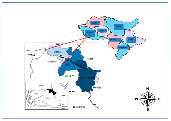 The study was conducted using samples from all districts of the Duhok governorate, Kurdistan region, Iraq. The city lies in the northwest of Iraq and the western part of the Kurdistan region, around 470 km north of Baghdad and 430–450 m above the sea level, and it borders Syria and Turkey. The area is presently populated by approximately 2 million people and contains around 1 million sheep and goats [18]. Along with another six districts, Sumeil, Zakho, Amedi, Shekhan, Bardarash, and Akre (Figure 1), Duhok covers 10,715 square km and lies at latitude 36 north and longitude 43 east. The agroecology of this governorate is characterized by a hot summer Mediterranean climate (Csa), showing sweltering, virtually rainless summers and cool to cold, wet winters. Precipitation falls in the cooler months, being heaviest in late winter and early spring. The city can receive around two or three snowy days yearly, with more severe snowfall in the uplands. Summers are virtually rainless, with rain returning in late autumn. The geographical situation of this province and the movement of the animals across the borders in this area might contribute to the increased prevalence of different diseases, including brucellosis. This may affect the sheep and goat sectors, which are important in sustaining the country’s food security.