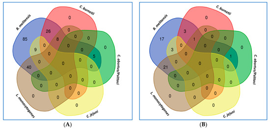 Illustration of the mixed infection of B. melitensis with other abortogenic causative agents in aborted cases in sheep (A) and goats (B). The Venn diagram was obtained online using (http://bioinformatics.psb.ugent.be/webtools/Venn/) (accessed on 15 February 2023).