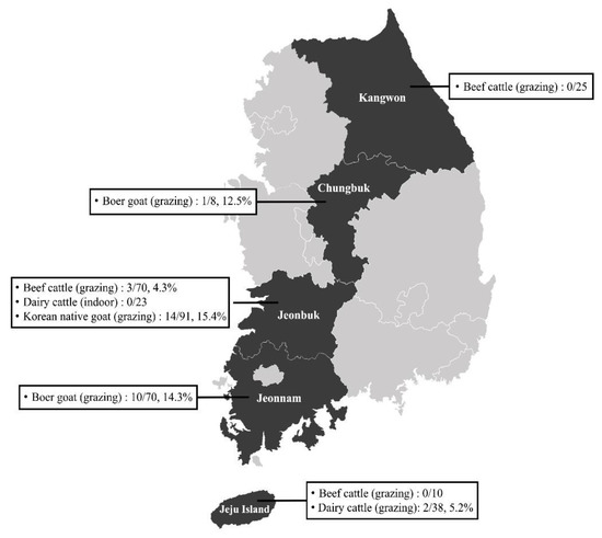 From October 2014 to June 2017, 335 blood samples were collected from healthy dairy cattle (n = 61), beef cattle (n = 105), Korean native goats (n = 91), and Boer goats (n = 78) on randomly selected farms in five different regions (Kangwon, Chungbuk, Jeonbuk, and Jeonnam provinces and Jeju Island) of the ROK (Figure 1). Each blood sample was collected in a collection tube with anticoagulant (BD Vacutainer®, Franklin Lakes, NJ, USA) and immediately delivered to the laboratory.