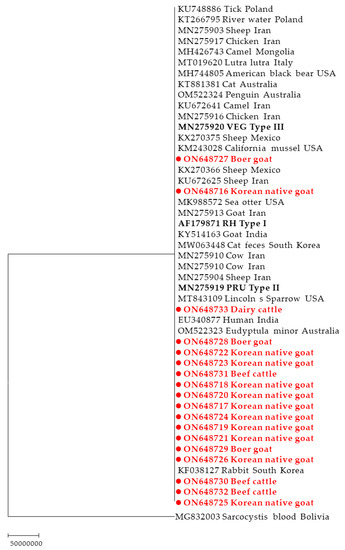 All secondary PCR products were purified using AccuPower PCR Purification Kit (Bioneer, Daejeon, ROK) and used for direct sequencing (Macrogen, Daejeon, ROK). PCR amplicons were sequenced using BigDye Terminator 3.1 Cycle Sequencing Kit on a 3500 xL Genetic Analyzer (Applied Biosystems, Foster City, CA, USA) according to the manufacturer’s instructions with the same primer set that was used for conventional PCR. The nucleotide sequences obtained in this study were aligned with those in the GenBank database using ClustalX (v.2.0) and compared with global references for T. gondii. Phylogenetic analysis was performed via the maximum-likelihood method implemented in MEGA11 using the best substitution model. Bootstrap values were calculated by analyzing 1000 replicates to evaluate the reliability of the clusters. The model used in this study was Jukes Cantor (JC) + G + I. The nucleotide sequences obtained herein were deposited in the GenBank database under the accession numbers ON648716−ON648733.