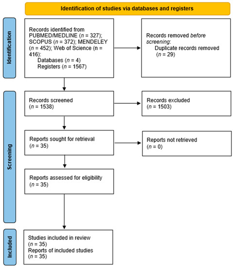 After removing duplicate articles from the databases (n = 29), exclusion criteria identified unrelated research (n = 1503). Application of inclusion and exclusion criteria allowed the identification of 35 papers potentially suitable for the systematic review (Figure 1).