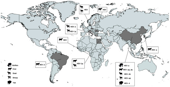 Zoonotic genotypes 3 and 4 are mainly transmitted through consumption of contaminated swine meat and meat products or contact with infected animals, primarily pigs [4]. While genotype 4 is primarily prevalent, and the predominant genotype, in China [5], genotype 3 is spread in all other regions of the world and is the most prevalent HEV genotype in Europe [6,7]. A large number of studies reporting genotypes 3 and 4 have been published, particularly from high-income countries where HEV transmission via the fecal-oral route is still largely unclear, with other possible transmission routes, such as consumption of milk, being investigated [8,9,10].