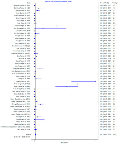 The following supporting information can be downloaded at: https://www.mdpi.com/article/10.3390/pathogens12040550/s1, Figure S1: Funnel plot results of the global meta-analysis; Figure S2: Funnel plot results of the cow subgroup meta-analysis; Figure S3: Funnel plot results of the goat subgroup meta-analysis; Figure S4: Funnel plot results of the sheep subgroup meta-analysis.