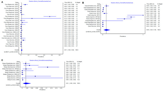 Cow (A), Goat (B) and Sheep (C) results of meta-analysis, random effects, heterogenicity, Q = 299.11, p = 0.00 and I2 = 93%; Q = 403.63, p = 0.00 and I2 = 97%; Q = 82.63, p = 0.00 and I2 = 89%, respectively [11,12,14,16,17,18,20,21,22,23,24,25,26,27,28,29,30,31,32,33,34,35,36,37,39,40,41,42,43,46,47].