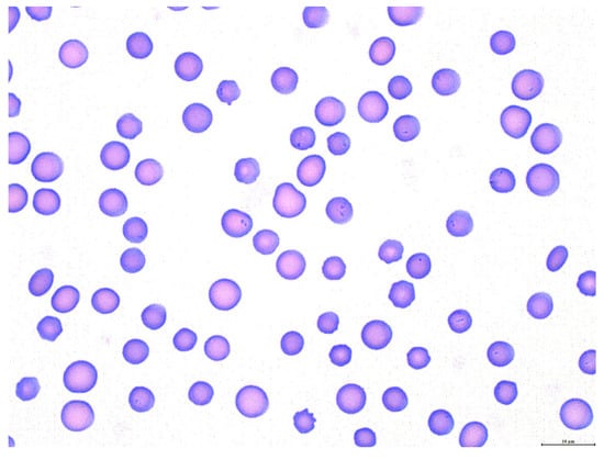 Photomicrograph of representative blood smear from Calf 1, day 111 post-inoculation with T. orientalis. Occasional erythrocytes contain 1–2, intracytoplasmic, 1–2.5 µm × 0.5 µm piroplasms, consistent with the T. orientalis merozoite stage. Scale bar: 10 µm.