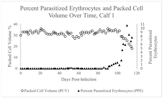 PPE and PCV over time, Calf 1. Piroplasms were first detected on day 42 post-inoculation, and from that point to the end of the experiment, PPE ranged from 0% to 10.7%. The PCV did not decline significantly until day 104, when it went into decline, reaching a nadir of 18% on day 115 post-inoculation.